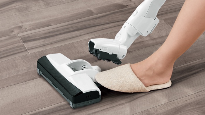 ペダルをポンと踏むだけで、子ノズルにチェンジ。狭いすき間や高いところなど、届きにくい場所を気軽にお掃除できます。
