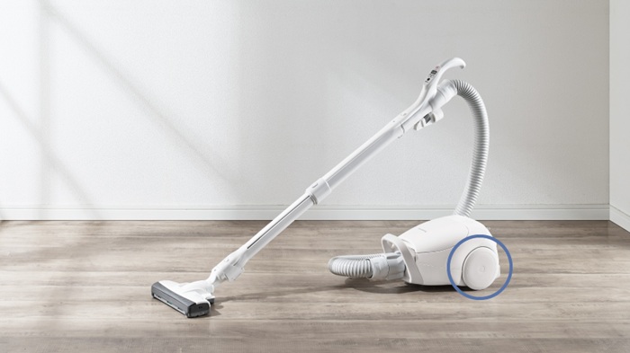 | 使い勝手を考えて、コード巻取りボタンは大きく、押しやすく。コード穴も指を入れやすく引き出しやすい形状です。 | 小回りがきき移動もスムーズなビッグローラーを採用。 |
