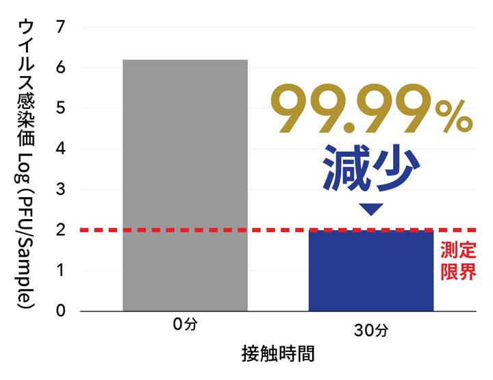フィルム表面の一価銅化合物ナノ粒子による銅イオンと活性酸素のダブル効果でウイルスや細菌を素早く減少させます。30分で各種ウイルスが99.99%以上減少することを確認しています。