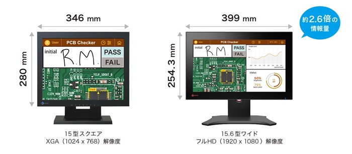 15.6型ワイド画面のフルHDモニターは、15型スクエア画面のXGAモニターと同等の設置面積で、約2.6倍の情報を表示できます。
