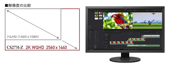 CS2731-Zは、27型のワイド画面に、WQHD(2560×1440)高解像度を表示できます。フルHDのモニターに比べて縦、横方向に広い解像度で一度に多くの情報量を表示できるため、スクロールの手間なく快適に作業できます。