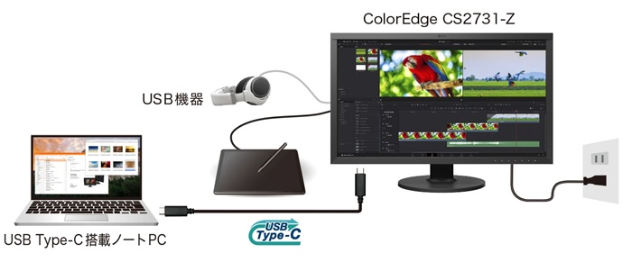 近年のUSBポートの少ないノートPCでもUSB Type-Cケーブルでモニターと接続するだけで、使い慣れたペンタブレットやヘッドホンなどのUSB機器をすぐに使えます。