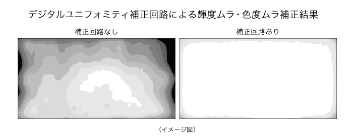 独自のデジタルユニフォミティ補正回路を搭載。輝度と色度が均一になるように画面全体をすべての階調で補正し、画面の隅々までムラの起こりにくい表示を保ちます。