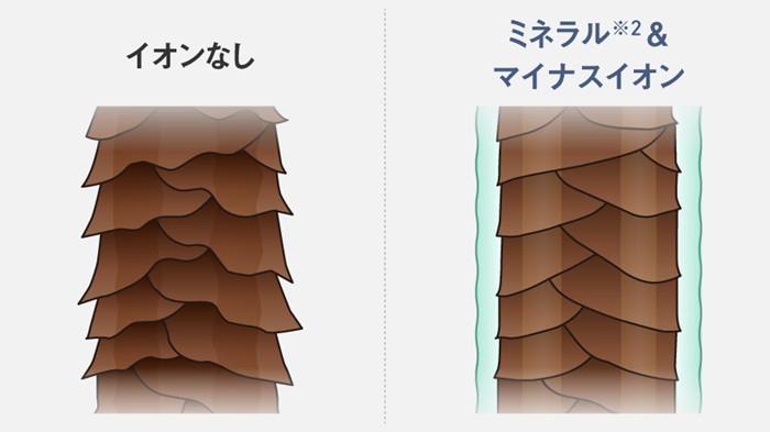 Wミネラル&マイナスイオンによって髪表面をコートし、キューティクルを密着ケア。髪の静電気も抑制します。