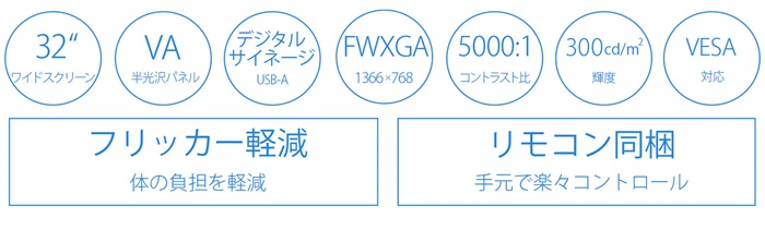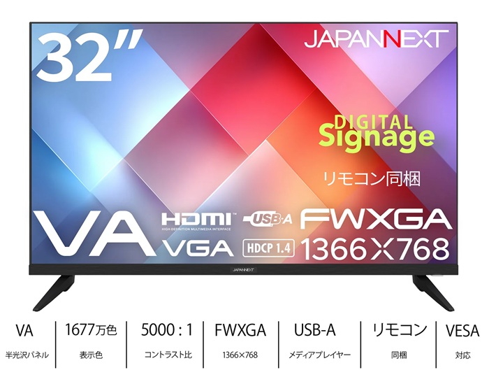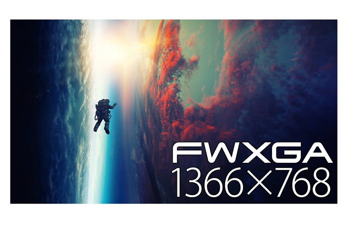 本製品はFWXGA(1366×768)解像度を採用。 アスペクト比は16:9となっておりサイネージに最適です。