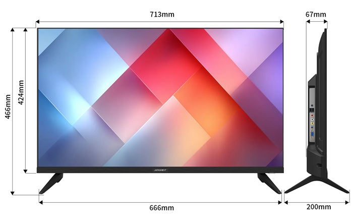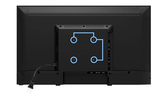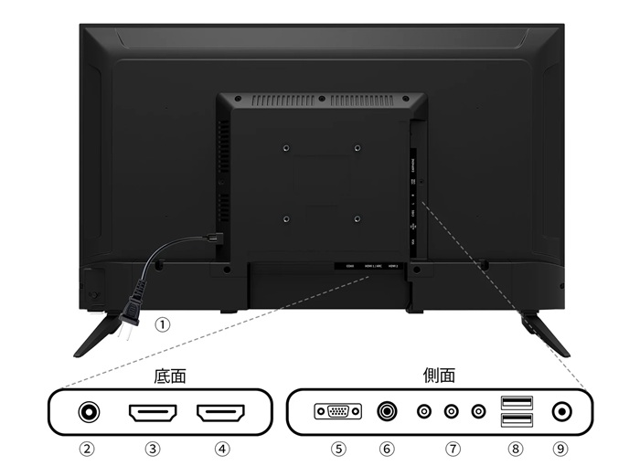 | ①電源ケーブル(プラグイン) ②コアキシャル音声出力 ③HDMI -1 :1.4 (1366×768) @ 60Hz (ARC対応) ④HDMI -2 :1.4 (1366×768) @ 60Hz ⑤VGA:1366×768 @ 60Hz ⑥Audio In:VGA入力の際に併用可能 ⑦ビデオ/音声入力 ⑧USB-A×2: 2.0 USBメモリ再生対応(5V/0.5A) ⑨イヤホン出力 |