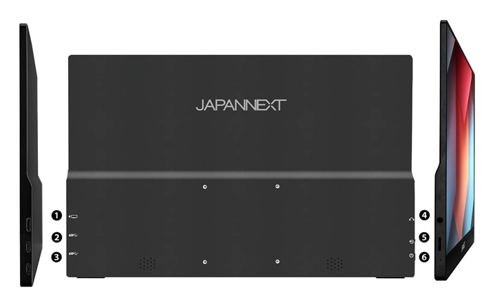 | ①miniHDMI:2.0 (3840x2160) @60Hz ②USB-C 1 : 3840x2160 @60Hz ③USB-C 2 : 3840x2160 @60Hz ④オーディオ出力 ⑤ロールキー ⑥電源ボタン |