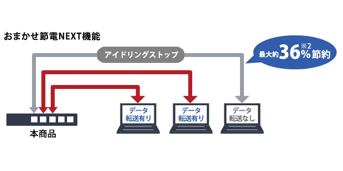 データの流れていないときの消費電力をカットする「おまかせ節電NEXT機能」を搭載。本商品に接続されたパソコンなどの電源がON状態でも、通信を行わない期間はアイドリング信号を止めることで大幅に消費電力を抑えます。通常使用時においても大幅な節電を実現します。