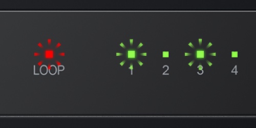 ループ発生時には、ループ発生したことをお知らせするために、ループ検知のランプが「赤色」に点滅します。また、どのポートでループが発生したかが分かるよう、発生したポートのランプが点滅し、迅速なループ排除が可能です。