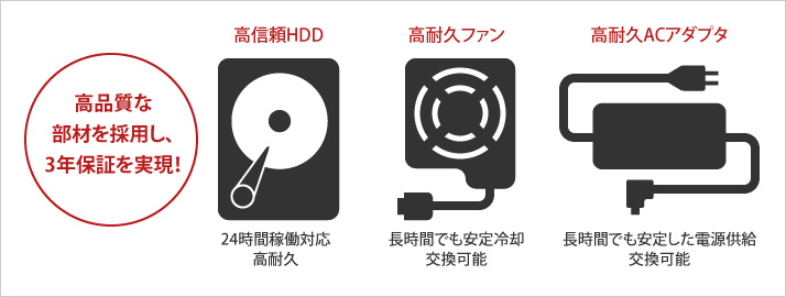常時稼働を想定し設計されたハードディスク、長期稼働でも安定冷却を可能にする高耐久ファン、安定した給電をする高耐久ACアダプターを搭載しているので高い信頼性と安定した動作が可能です。これにより故障のリスクが低減し寿命が改善したことにより、本商品の3年保証が実現しました。