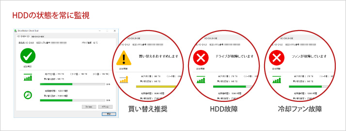 ドライブのRead/Writeの容量合計が簡単に分かるソフトウェア「DriveStation Check Tool」対応、ユーザー自身で使用状況や現在の状態を把握出来ます。HDD買い換え推奨通知同様、HDDやファンの故障をお知らせします。