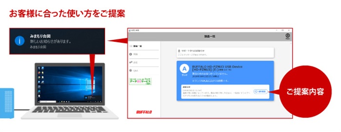 パソコンに接続されている外付けハードディスクの自己診断機能「S.M.A.R.T.」情報をクラウドに蓄積し、お客様のハードディスクの健康状態を把握することで、ハードディスクの状態判定をお知らせするサービスです。対応商品を接続しているパソコンにクライアントソフトウェア「みまもり合図」をインストールすることにより、本サービスが提供されます。