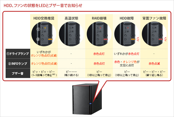 HDDの取り替え推奨タイミング※を事前に検知してLEDとブザー音※1でお知らせします。また、HDDや冷却ファンの故障も検知してお知らせ。長期稼働にも安心してお使いいただけます。