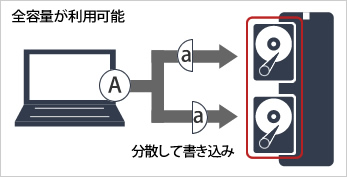 内蔵している2つのドライブにデータを分散して保存します。4つのモード中、最も高速にデータの読み書きが行なえますが、ドライブが故障した際、データサルベージによるデータ復旧がしにくいという特徴があります。