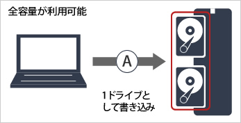 内蔵している2つのドライブを1つの大きなドライブとして扱うモードです。ストライピングと似ていますが、分散書込みをしないため、高速性にはかけますが、ドライブが故障をした際、データサルベージによるデータ復旧が比較的しやすいのが特徴です。