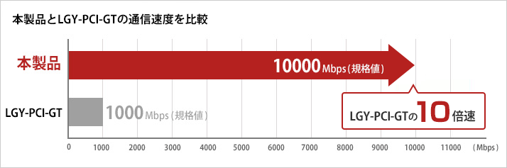 10GbE対応のNASや法人様向けスイッチの導入に合わせ、10Giga化を企業内に進めるのに最適なマルチギガ対応LANボードです。従来の1,000Mbps対応LANボードで通信した場合と比べ、10倍の高速化を実現します。(理論値)