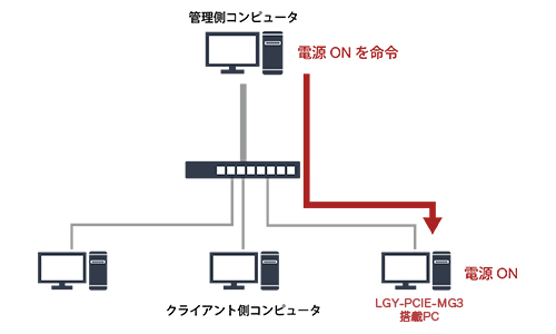 本製品はハードウェアによるWake on LAN (WoL)機能に対応しています。本製品宛てに、マジック・パケットを送信することで、取り付けたパソコンを通電シャットダウン状態から起動させることができます。リモートワークなど、遠隔のパソコンを利用しなければならない場合に、電源オフのパソコンでも電源ボタンを押さずにパソコンを起動できるようになるため、便利です。
