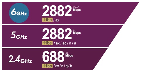 | 準拠規格(最大転送速度※理論値) | 【IEEE802.11be】最大2882Mbps (6GHz帯)、最大2882Mbps※ (5GHz帯)、最大688Mbps※ (2.4GHz帯) |