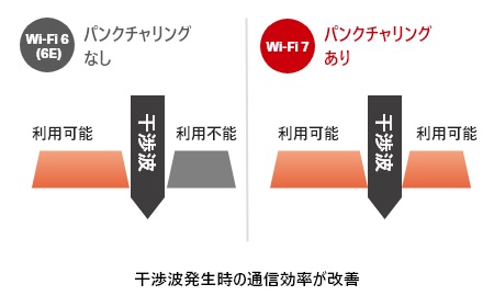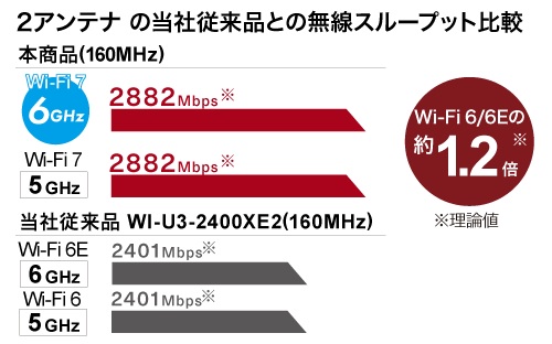 最大転送速度が6GHz/5GHzで従来品(Wi-Fi 6/6E)の約1.2倍に向上