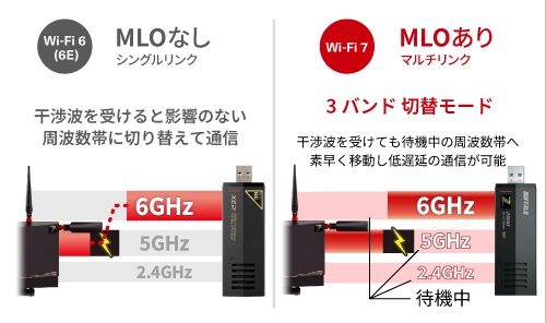 MLOを利用することで、2.4GHz/5GHz/6GHzのうち、複数の周波数帯に接続しながら、最適な周波数帯を瞬時に切り替えて利用できるようになりました。干渉波を受けても、待機中の周波数帯へ素早く通信を移行することで遅延が起きにくくなるなど、通信の安定化が期待できます。