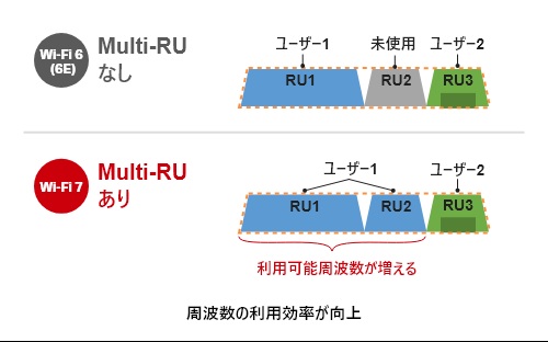 Multi-RUは、無線通信における1ユーザーあたりの周波数割り当てを、さらに細かい単位で実現できるようにするものです。従来は1ユーザーに1つのRU(Resource Unit)までの割り当てでしたが、Wi-Fi 7では、1ユーザーに複数のRUを割り当てることができるようになりました。周波数の利用効率が向上します。