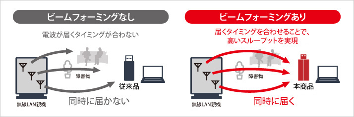 本商品は、親機が子機の位置や距離を判別して、複数のアンテナの電波を同時に届かせ高いスループットを実現する「ビームフォーミング」に対応しています。遠距離でも電波感度、通信速度を維持することができ、障害物が多い環境においても、安定したWi-Fi通信ができます。