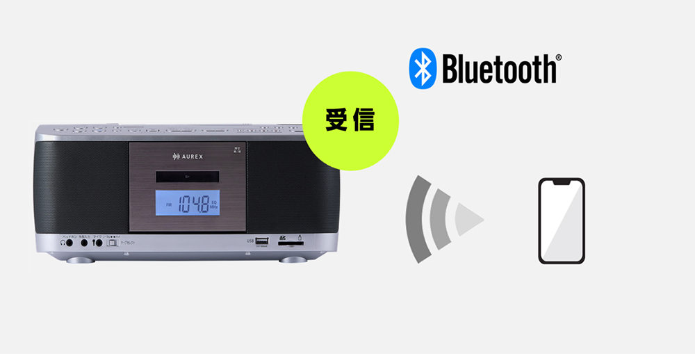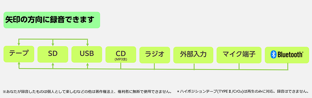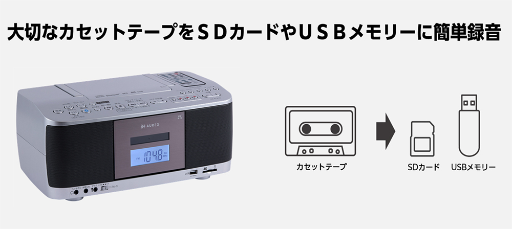 テープへの録音はもちろん、SDカードやUSBメモリーへの録音や、CD(MP3を含む)からSDカード、USBメモリーへの倍速録音にも対応しています。また、スマートフォンや音楽プレーヤーなどの音源もBluetooth®で手軽にSDやUSBに簡単に録音ができます。