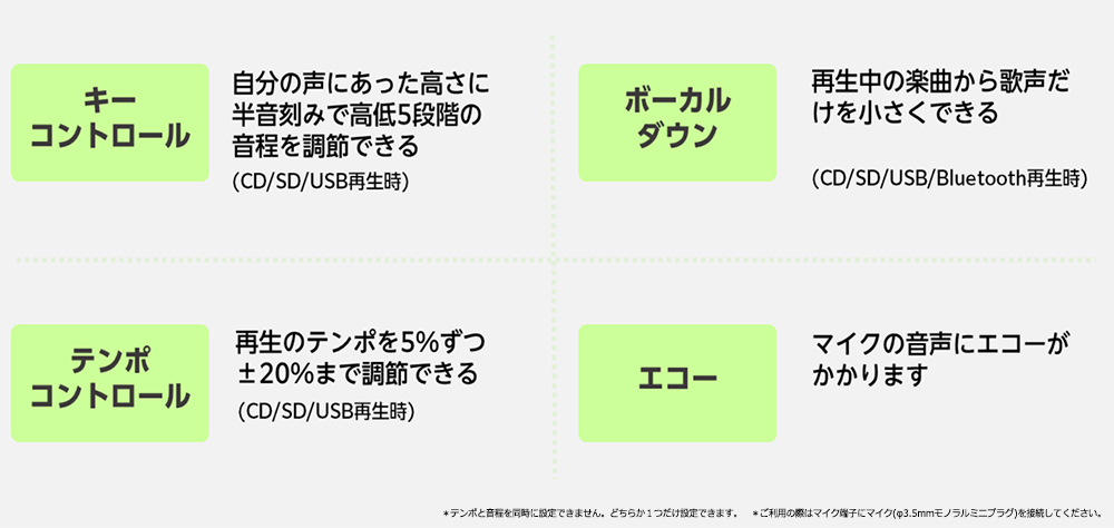 | 入出力端子 | 【外部入力/ヘッドホン出力】φ3.5mmステレオミニジャック、【マイク入力】φ3.5mmミニジャック、【SDカード挿入口】SD規格に準拠した入力端子、【USBメモリー挿入口】USB1.1、USB2.0、DC5V 0.5A |