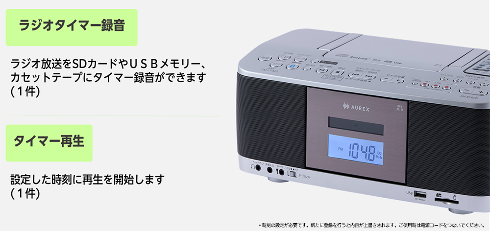 | 電池持続時間(東芝単2形アルカリ乾電池使用時) | 【CD/Bluetooth®再生時】約9時間、【ラジオ受信時】約12時間、【テープ再生時】約9時間、【SD再生時】約11時間、【USB再生時】約10時間 |
