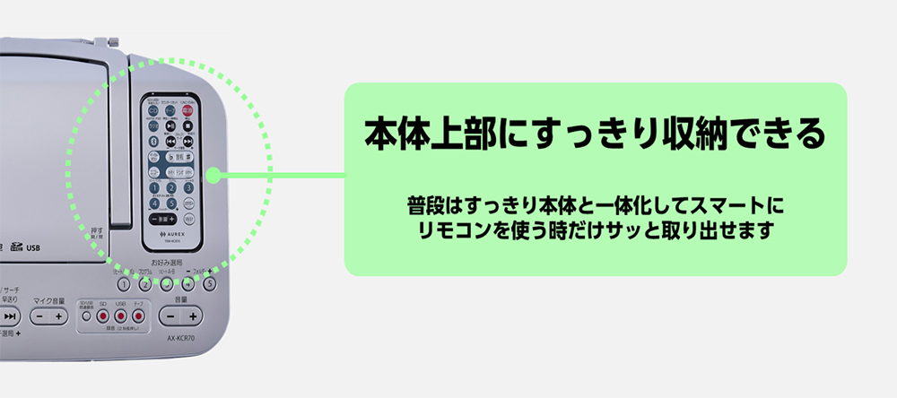 手元で操作できる便利なリモコン付き。本体上部に収納できるので整頓しやすく手に取りやすい。