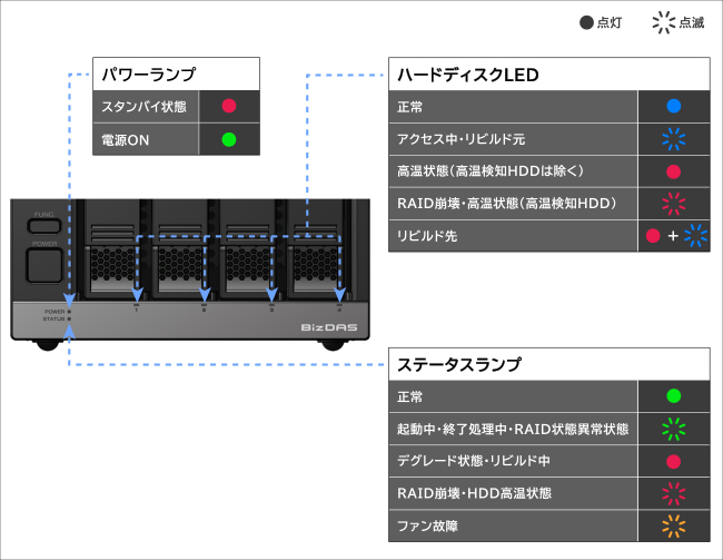 本体のランプ表示で、ハードディスクが故障しているかどうかを見分けることができます。故障時は「赤色」に点滅します。