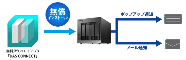 「DAS CONNECT」をインストールすれば、本商品のドライブ情報などのステータスが確認できます。なんらかのトラブルが発生した際には、ポップアップで通知したり、指定したメールアドレスにメールを送信するように設定できます。