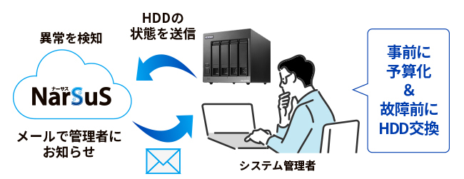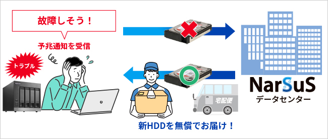 お使いのハードディスクがまだ故障していなくても、NarSuSで予兆通知が発行された時点で無償でハードディスクを交換いたします。