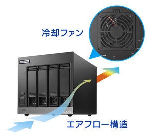 ハードディスク本体内の温度上昇による故障のリスクを低減するために、冷却ファンを搭載しました。また、ハードディスク下部から背面に向けてのエアフロー構造を採用。長時間の運用でも安心してお使いいただけます。