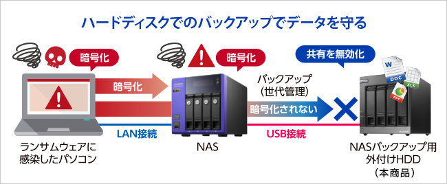 NASのデータをハードディスクにバックアップし、ハードディスクを読み書きできないようにしておくことで、データをランサムウェアから守ることができます。
