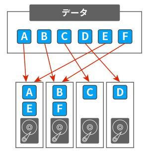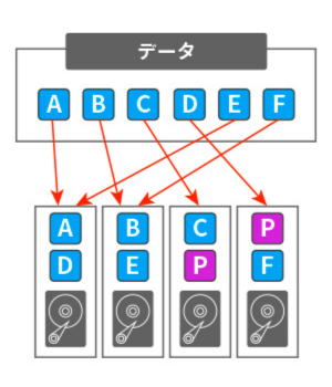 複数のドライブにデータを分散して書き込みします。「パリティ」と呼ばれる復元用コードを同時に格納することで耐障害性も確保します。4台のドライブのうちどれか1つが故障しても、ドライブを交換することで復旧が可能です。