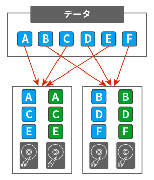 ドライブ2台でデータを2重化したペアを、さらに2台×2でまとめて1組のハードディスクとしてデータを分散して保存します。