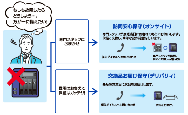 オフィスなどでのデータ運用の際には、故障から交換対応が完了するまでのダウンタイムを最小限に抑えるために、通常保証+有償保守サービスへのご加入がおすすめです。