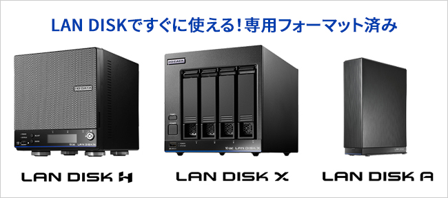 メーカーNAS「LAN DISK H」「LAN DISK X」「LAN DISK A」の専用フォーマット済みのため、購入後すぐに接続してご使用いただけます。