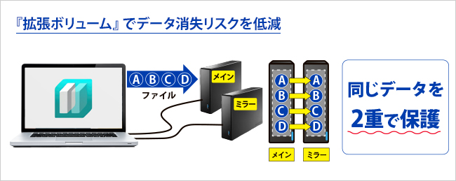 『RAIDeX(レイドエックス)』とは、”RAID”に代わるメーカー独自の技術です。データを2重に保存し、読み込みを片方のハードディスクに偏らせることで、RAIDの弱点であるハードディスクの同時故障によるデータ消失のリスクを低減します。