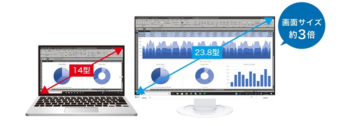 23.8型フルHD(1920×1080ピクセル)解像度のIPSパネルを搭載。ノートPCと接続することにより、例えば14型のノートPCと比較した場合、画面サイズが約3倍に広がるため、ウィンドウの切替えやスクロールの回数が減り、効率的に作業できます。