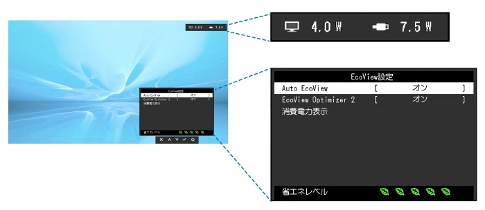 モニター前面のセンサーで周囲の明るさを測定し、最適な画面の明るさに自動調整する「Auto EcoView」機能。画面の明るさや表示コンテンツの視認性が保持されるよう補正しながら、バックライトの明るさを調整する「EcoView Optimizer 2」機能。2つの機能で画面の明るさを自動で最適化し、消費電力を最大60%※カットします。