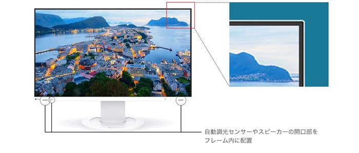画面の枠を感じさせない3辺フレームレスデザインを採用。無駄を削ぎ落としたノイズレスデザインが机上の圧迫感を和らげます。