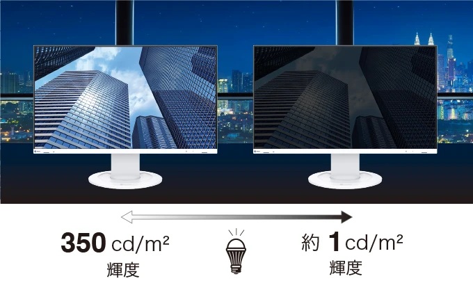 約1cd/m2まで輝度が下げられる輝度の調整範囲が広く、約1cd/m2の低輝度に画面を暗く調整でき、低輝度時も表示が安定しています。どのような環境でも、最適な明るさに調整し、目への刺激を抑えます。 |