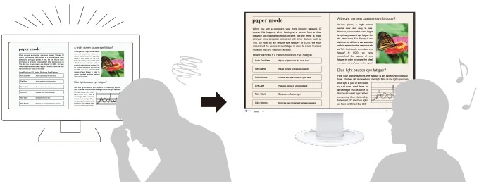ブルーライト約80%カットあたかも紙のような見え方に切替えできる「Paperモード」を搭載。一般的な液晶モニターに比べ、輝度、コントラスト比を抑え、画面を暖色系の色味にすることで、ブルーライトの量を低減。自動調光機能Auto EcoViewとの併用で、ブルーライトを約80%カットします。 |