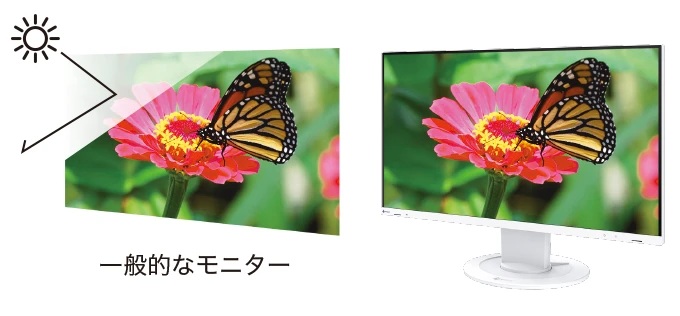 映り込みが目立たない液晶面は、照明など外光の反射や映り込みが目立ちにくいアンチグレア(非光沢)処理を施しています。画面の見えにくさによるストレスに加え、目の筋肉の緊張による疲れ目の抑制も見込めます。 |