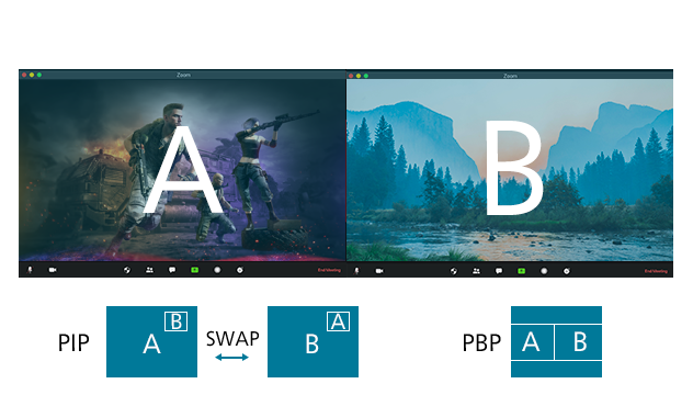 左右2画面分割のPbP(ピクチャー・バイ・ピクチャー)と、画面の中に小画面を映すPiP(ピクチャー・イン・ピクチャー)を選択することが可能です。