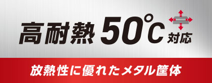 放熱性に優れたメタルケース採用に加え、「動作時環境温度50℃」を実現し、高温になりやすい環境でも安心して運用可能です。