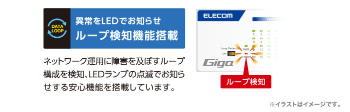 ループ検知機能を搭載しています。LEDランプの点滅によりネットワークループ発生をお知らせし、ネットワーク障害の解消を促します。