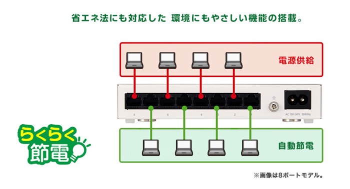IEEE 802.3az(EEE規格)に対応しているスイッチや端末との組み合わせで手間なく自動的に省エネを実現します。 パソコンがシャットダウンしている環境では、大幅な電力の節約を実現することができます。